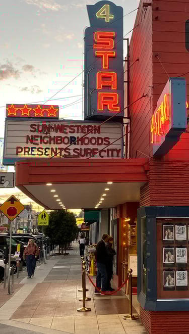 The 4 Star Theater in San Francisco was built in 1912. Located in the Richmond District between Golden Gate Park and the Presidio of San Francisco, it lies in the heart of a vibrant community that offers restaurants, shops, coffee houses, and more! San Francisco's excellent mass transit to takes you to Fisherman's Wharf, Telegraph Hill, the Marina District, and The Embarcadero on the peninsula. Lots to see and do! Join us for CDFF 2026!